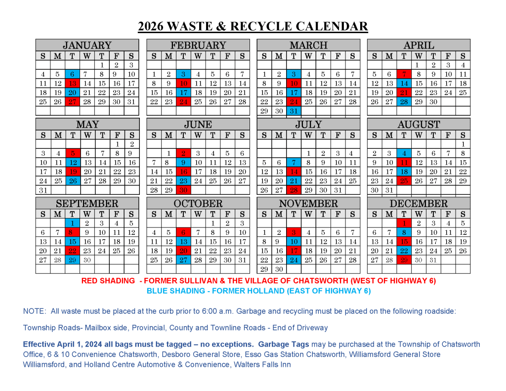 Effective April 1, 2024 all bags must be tagged – no exceptions. Garbage Tags may be purchased at the Township of Chatsworth